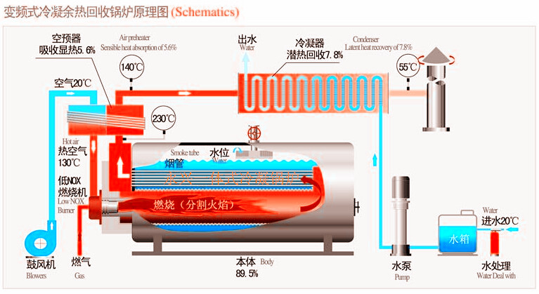 9.配套冷凝器后,蒸汽鍋爐排煙溫度降低到水蒸氣露點(diǎn)以下,充分利用燃料燃燒后剩余的水蒸氣汽化潛熱,使鍋爐效率提高100%以上(低位發(fā)熱量計(jì)算),同時(shí)降低NOx排放,清潔環(huán)保。